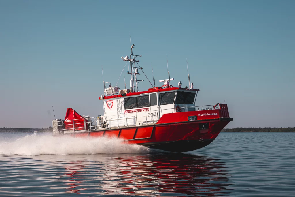 Finnish shipyard Kewatec have delivered a groundbreaking firefighting and rescue boat to the City of Kiel Fire Department equipped with an advanced hybrid waterjet propulsion. In Germany, They have collaborated with MOLABO, the leading manufacturer of 48-volt high-performance drives to combine MOLABO’s Aries i50 electric motors with Kewatec’s e-FiFi 1470 design. Also in Germany there is the 13 kg heavy aluminium Uniboot, powered by a a 1000 watt electric outboard motor. In the Netherlands, Verhoeff produces a freefall aluminium lifeboat, with electric propulsion, using the most advanced type of Li-Ion battery packs The 6.55meter E-Mako-655 rescue boat is a Norwegian solution from Evoy and Viking Norsa.